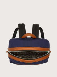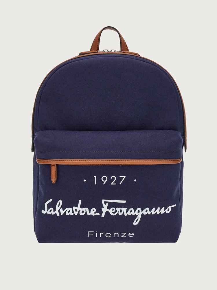 Travel light with this cool fabric backpack with luxury leather trim for a modern take on a classic. The textbook silhouette features a front pocket with Salvatore Ferragamo 1927 logo, a top zip with contrasting leather trim and a jacquard lined interior with an all over Gancini pattern for a sophisticated finish. - Composition: fabric - Made In ITALY