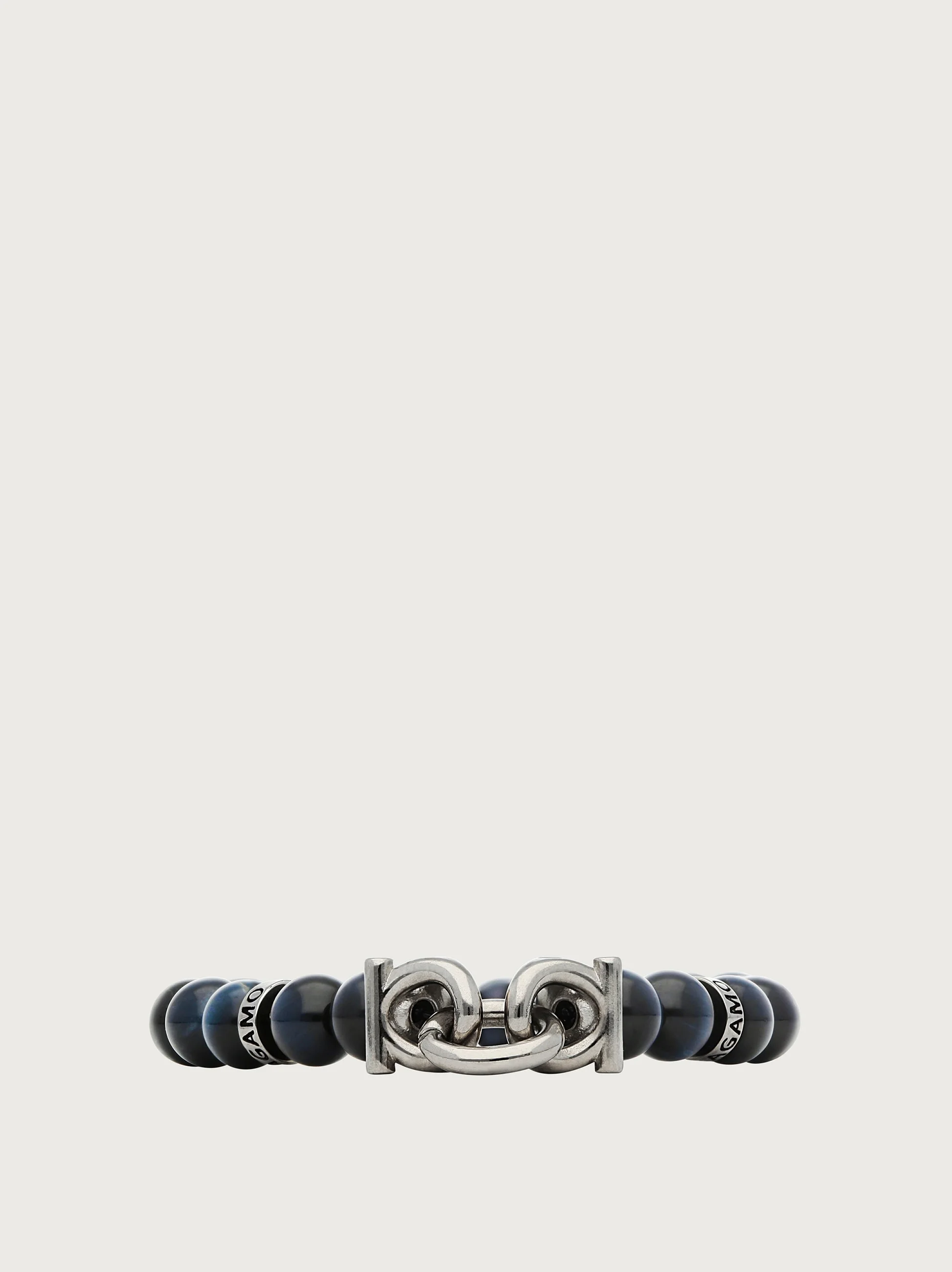 Ethno chic stretch bracelet made with lava stone pearls and metal Gancini details. Small inserts with Ferragamo lettering for a fresh and contemporary accessory. Length 17 cm. - Composition: brass and semi precious stones - Size 17 - Made in ITALY - Product code: 770150 717497