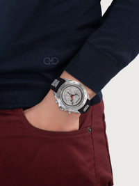 Dynamic, playful and contemporary: the new Ferragamo Urban Chrono integrates the aesthetics of timepieces for the young generation with the Swiss Made chronograph movement. Size: 43 mm Movement: VERTIME BV SM927 - Chrono quartz Case: Stainless steel case with black numbers - Crown with "F" embossed - Case Back: Palazzo Spini Feroni engraving Dial: Grey guilloché sunray finishing dial - hands with luminous Bracelet: Black silicon strap with Ferragamo logo embossed in contrast - Butterfly buckle with double Gancini logo Glass: Sapphire crystal, anti-reflection, scratch-resistant WaterResistance: 50 meters 2+2 Year Warranty Outer box, packaging, warranty and instruction booklet - Composition: Stainless steel case and silicon strap - Product code: 611274 760848 - Made in SWISS