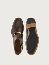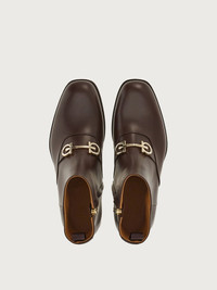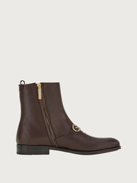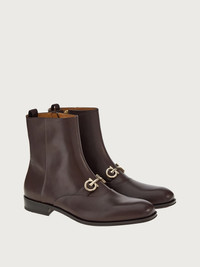 Old school styles meet contemporary creativity in this new take on the ankle boot, by Ferragamo. A harmonious blend of practical features and sophisticated style, the upper is made of soft, tumbled, and buffed calf leather, with a golden Gancio across the instep. The slightly squared tip echoes a modern feel, and the leather sole with rubber island is the perfect finish. Made according to the “Originali” construction method, the sole is applied with a series of operations carried out almost entirely by hand, at a level of excellence which can only be carried out by expert shoemakers. - Composition: calf leather - Made In ITALY