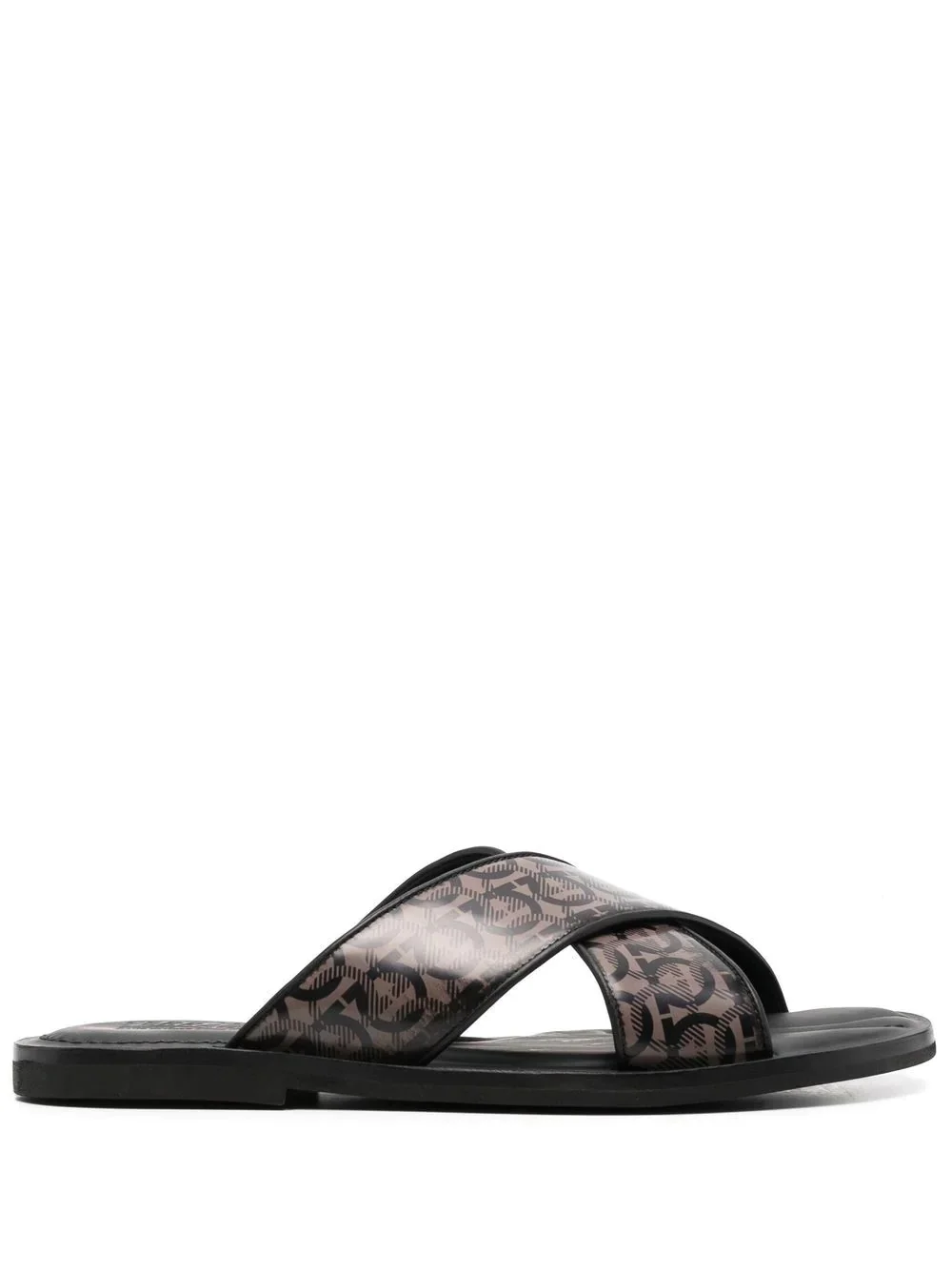 Gancini crossover strap sandals Gancini crossover strap sandals from SALVATORE FERRAGAMO featuring brown, open toe, tonal stitching, branded insole, slip-on style and flat rubber sole. Made in Italy Composition Outer: Calf Leather 100% Lining: Calf Leather 100% Sole: Rubber 100% SIZE & FIT Measurement HEEL 0.59 in(1.5 cm) Sole height 0.39 in(1 cm)