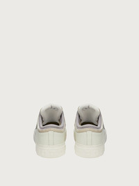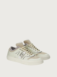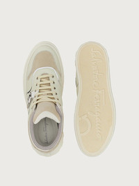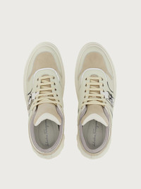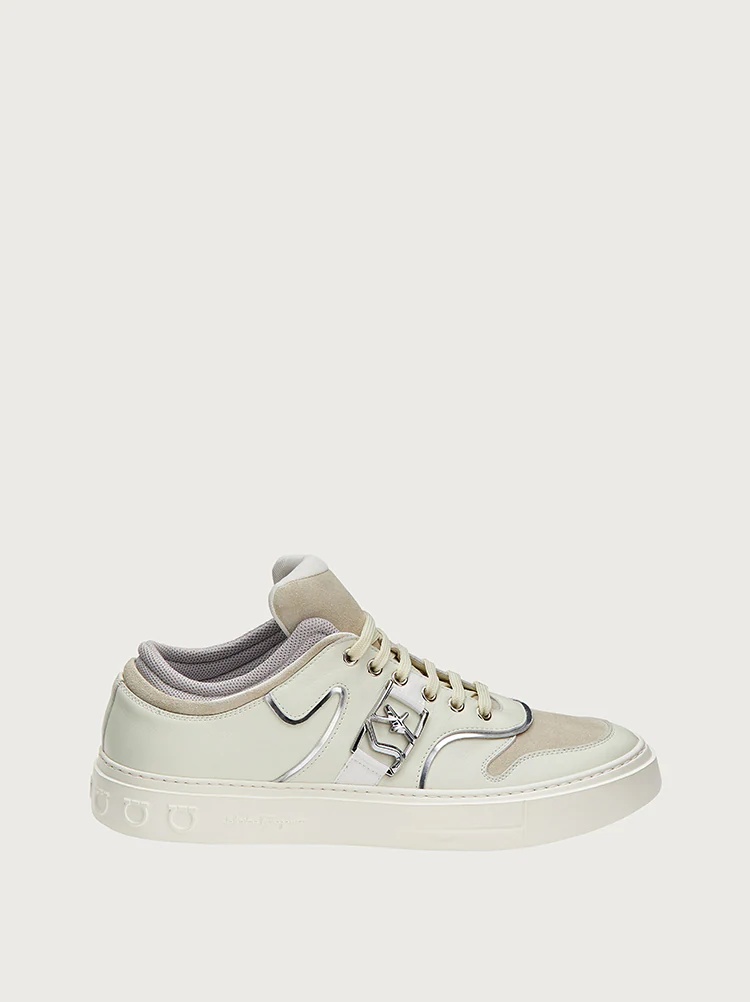 Eye catching inspiration with street style details, this sneaker is the perfect combination of high fashion and streetwear. This Ferragamo sneaker features a smooth calfskin upper with suede inserts, decorated with a silver laminated piping. The golden metal eyelets match the side SF buckle, made of resin to bring lightness to the design. The oversize tongue confirms the streetwear vibe, as does the ultra-light rubber sole with custom tread. - Composition: Calf leather and suede - Made In ITALY