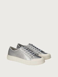 Space age edition of the lace up sneaker, made of laminated calf leather in a glowing silver hue. The 3D effect of the all over imposed Gancini pattern creates a refined design, whose distinctive look pairs wonderfully with the minimal outline of the shoe. The tip is reinforced with the same ultra light rubber of the sole, with its distinctive, personalized tread. - Composition: Laminated leather - Made In ITALY