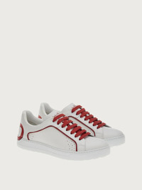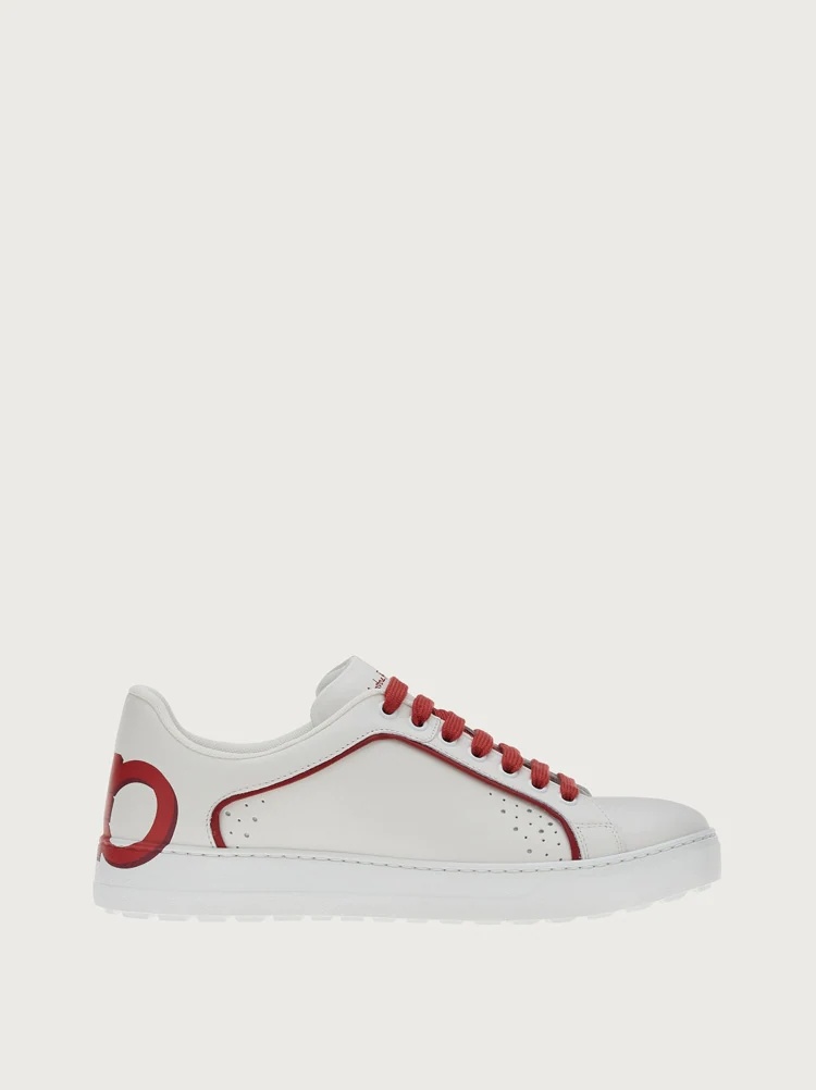Unisex sneaker with clean, classic lines and iconic details. Made of soft calf leather, the upper has a maxi Gancini printed on the back of the shoe, a fashion feature with street appeal. The colored piping and perforations on the upper create texture and movement, while the shark tooth sole adds a touch of grit. Effortlessly cool. - Composition: calf leather - Made In ITALY