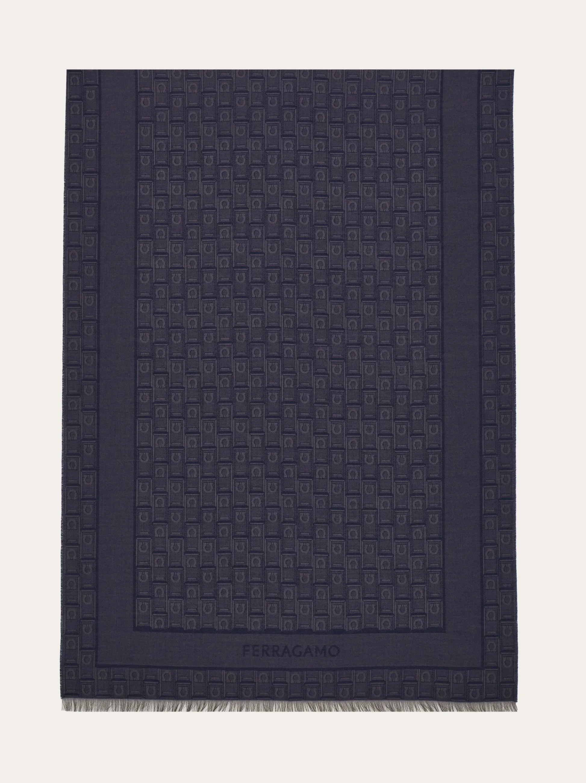 The new Gancini monogram print adorns this metropolitan stole. The large smooth frame with incorporated logo complements the design with a graphic and elegant edge. - length 78.7 IN width 27.5 IN - Composition: 47% cotton, 37% wool and 16% silk - Made in ITALY - Product code: 520121 776150