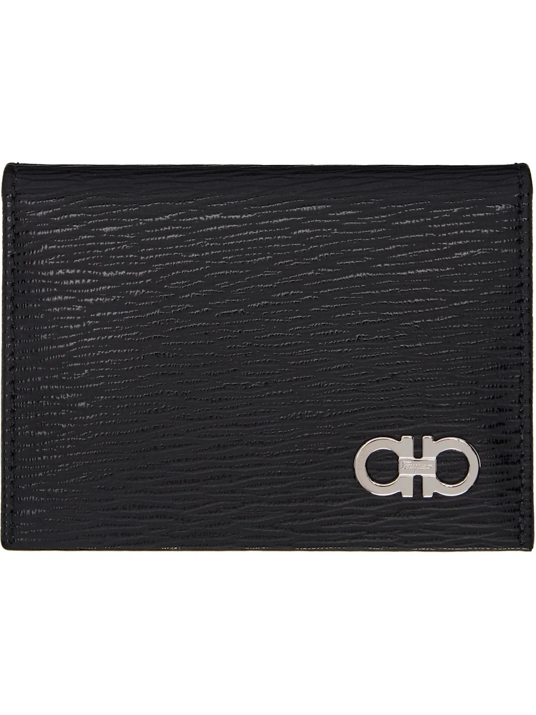 Hammered calfskin bifold card holder in black. · Logo hardware at face · Four card slots · Single note slot · Canvas lining · H3" x W4.25" x D0.75" Supplier color: Nero/Fjord blue Calfskin. Made in Italy 251270M164018