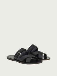 New summer sandal with a timeless silhouette and contemporary details. This versatile slip on is ideal for warmer days; with a chunky leather strap with karung print and a braided detail across the arch, and two slim straps across the toes with a small metallic Gancio in a palladium finish. Artisanal treatments are used to enhance the natural grain of the leather, and bring out a buttery softness that will ensure the most comfortable fit. Leather sole with rubber heel. - Composition: calf leather - Made In ITALY