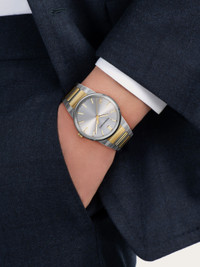 Ferragamo Sapphire enhances the distinctive elements of this best-selling design distinguished by a sapphire glass that extends over the entire surface of the case, creating a unique play of light and reflection. Size: 41 mm Movement: RONDA 703 - 3 hands quartz Case: Bicolor (stainless steel & IP yellow gold) - Sapphire glass top ring - Crown with embossed “F” Dial: White silver sunray with double Gancini index at 8h Bracelet: Bicolor (stainless steel & IP yellow gold) bracelet - Butterfly buckle with Ferragamo logo Glass: Sapphire crystal anti-reflection, scratch-resistant WaterResistance: 50 meters 2+2 Year Warranty Outer box, packaging, warranty and instruction booklet - Composition: Stainless steel and IP yellow gold case and bracelet - Product code: 611305 772616 - Made in SWISS