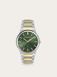 Ferragamo Sapphire enhances the distinctive elements of this best-selling design distinguished by a sapphire glass that extends over the entire surface of the case, creating a unique play of light and reflection. Size: 41 mm Movement: RONDA 703 - 3 hands quartz Case: Bicolor (stainless steel & IP yellow gold) - Sapphire glass top ring - Crown with embossed “F” Dial: Green sunray with double Gancini index at 8h Bracelet: Bicolor (stainless steel & IP yellow gold) bracelet - Butterfly buckle with Ferragamo logo Glass: Sapphire crystal anti-reflection, scratch-resistant WaterResistance: 50 meters 2+2 Year Warranty Outer box, packaging, warranty and instruction booklet - Composition: Stainless steel and IP yellow gold case and bracelet - Product code: 611305 772615 - Made in SWISS