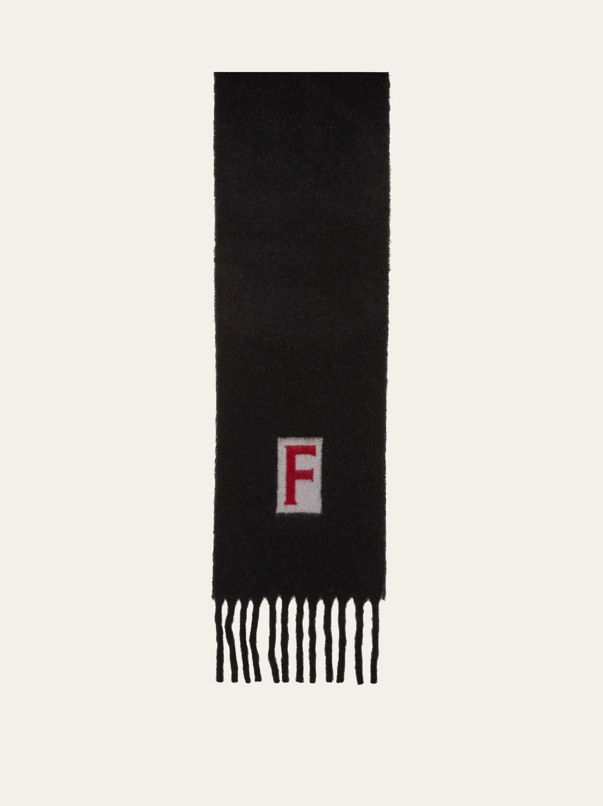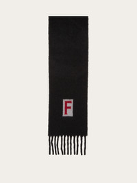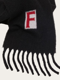 A new puffy, textured take on a wool and alpaca scarf boasting braided maxi-fringed edging and jacquard detailing with the contrasting F on the bottom. Chunky and soft, it is perfect for finishing off your more on-trend looks or for adding a cool edge to colder days. - length 86.6 IN width 10.2 IN - Composition: 58% alpaca, 24% wool, 18% polyamide - Made in ITALY - Product code: 520108 770179