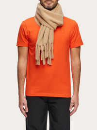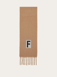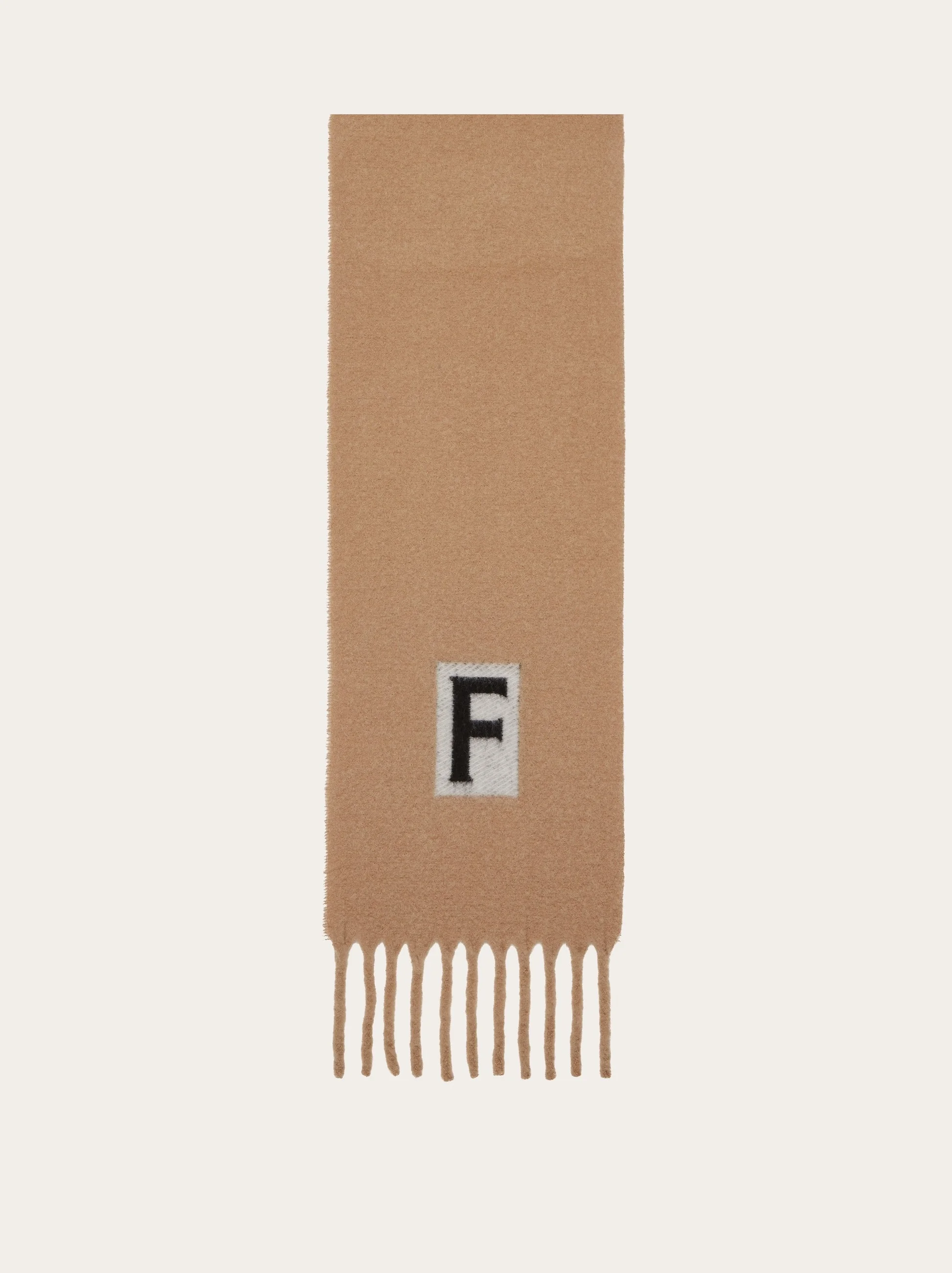 A new puffy, textured take on a wool and alpaca scarf boasting braided maxi-fringed edging and jacquard detailing with the contrasting F on the bottom. Chunky and soft, it is perfect for finishing off your more on-trend looks or for adding a cool edge to colder days. - length 86.6 IN width 10.2 IN - Composition: 58% alpaca, 24% wool, 18% polyamide - Made in ITALY - Product code: 520108 770181