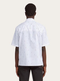 Unique and full of character, this cotton blend shirt stands out for its wide bowling-style collar, with a small button at the top to change the silhouette. The fil de coupé weave is used to create a graphic striped print featuring the iconic Ferragamo F, with contrasting pattern on the inside. Regular fit, straight hem. - Composition: 90% cotton, 10% polyester - Made in ITALY - Product code: 143806 770864