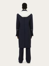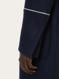 Distinctive, gentlemanly and high fashion, this single breasted jacket is made of pure wool and features a contrasting piping on the cuffs, breast pocket, and shoulders. The hood, in technical fabric, confirms a trendy feel, breaking the formality typical of this cut. Details include a button up front, small pointed lapels, and three patch pockets on the front. Below the knee length. - Composition: 100% wool - Made In ITALY