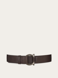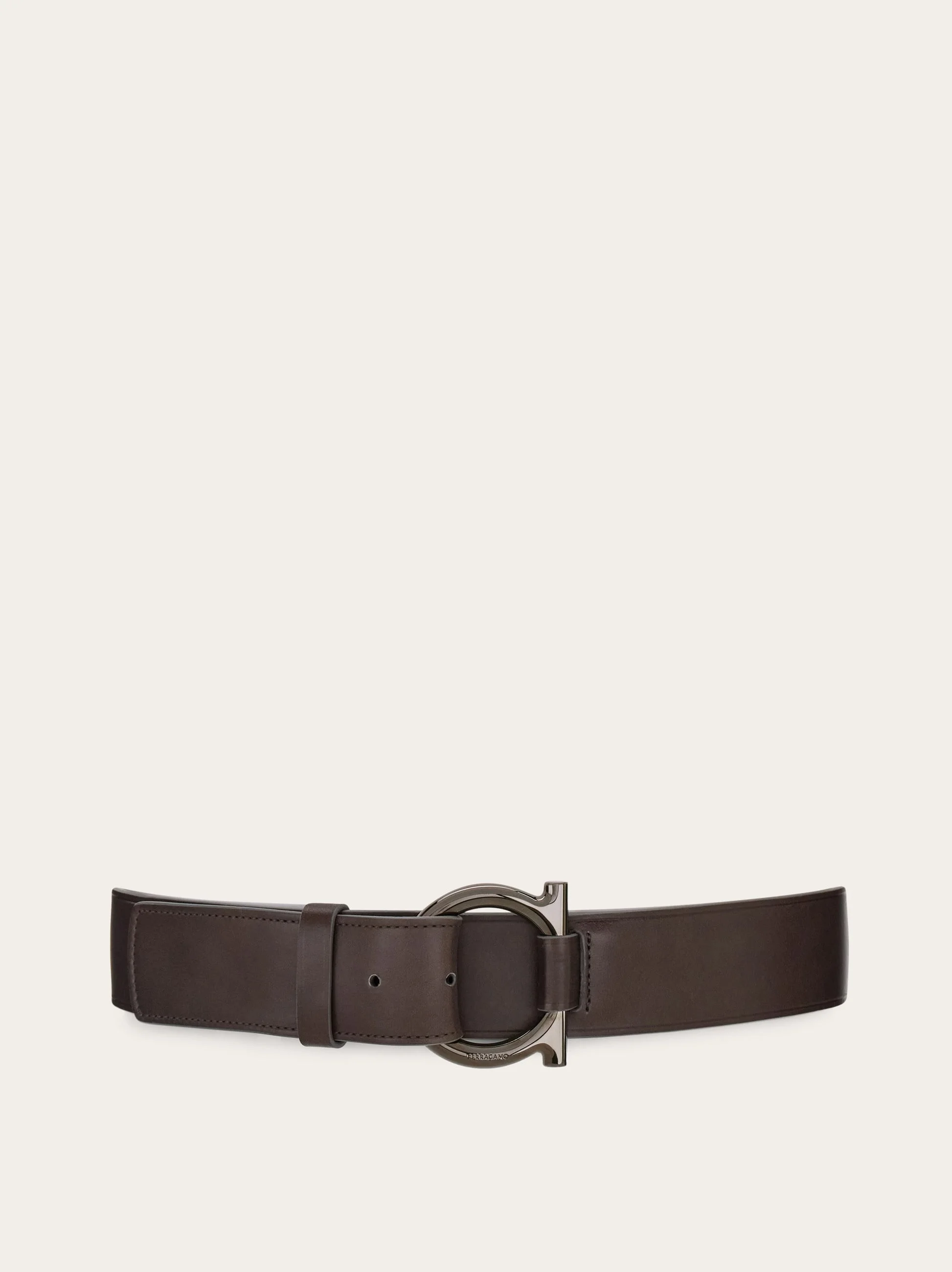Understated belt with geometric-profiled strap and topstitching along the edge. The Gancini buckle with sliding fastening mechanism adds a refined edge, thanks to the ruthenium finish. - height 1.5 IN - Composition: calfskin - Made in ITALY - Product code: 670313 786001