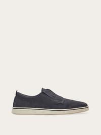 This slip-on sneaker combines a dynamic design with faux lace-up ties, inspired by classic Derby shoes. Stamped with the signature Gancini detail in a 3D finish, it features distinctive side panels and elastic inserts for a comfortable fit. The rubber sole is accented with a contrasting edge and an embossed logo on the side. - Composition: suede calfskin - Made in ITALY - Product code: 02A000 784326