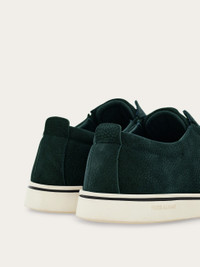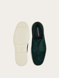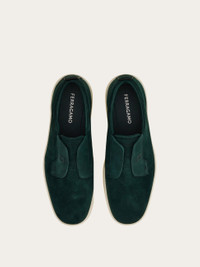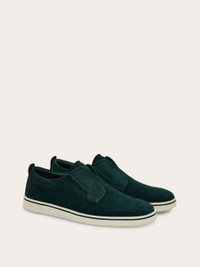 This slip-on sneaker combines a dynamic design with faux lace-up ties, inspired by classic Derby shoes. Stamped with the signature Gancini detail in a 3D finish, it features distinctive side panels and elastic inserts for a comfortable fit. The rubber sole is accented with a contrasting edge and an embossed logo on the side. - Composition: nubuck - Made in ITALY - Product code: 02A000 786895