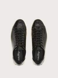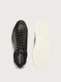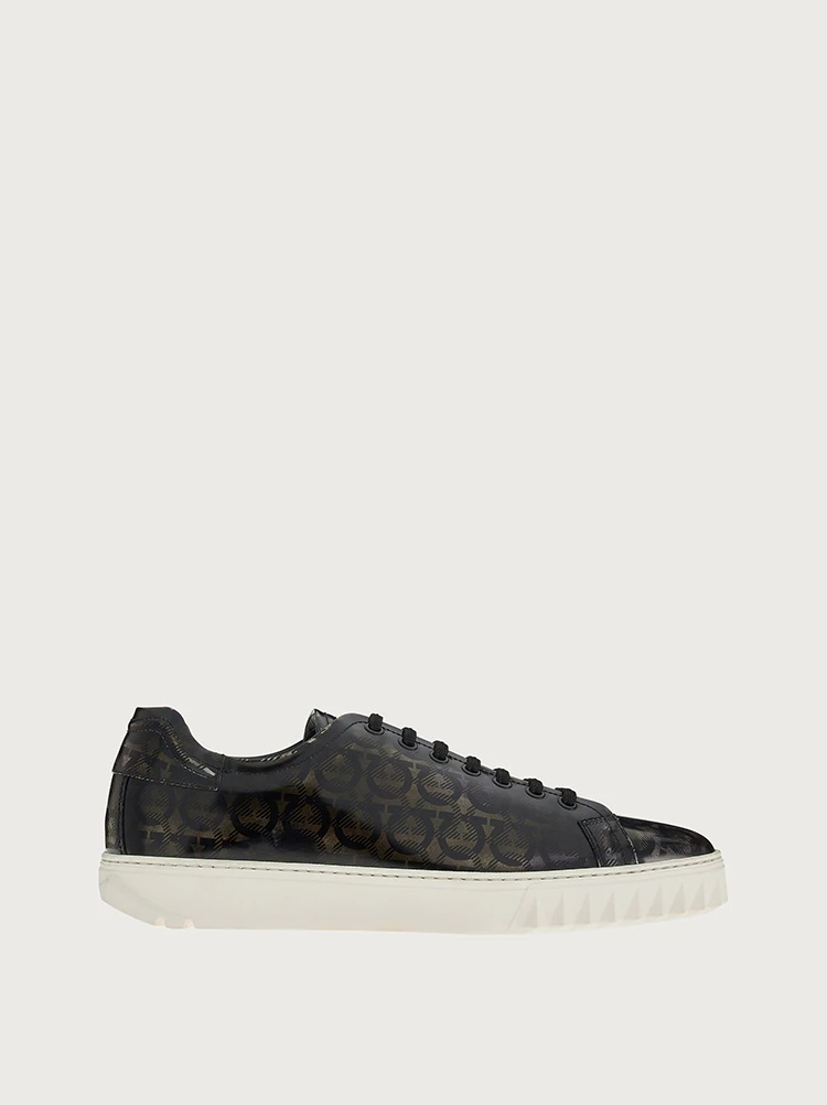 Sleek and cool, with a street style edge and iconic inspiration: made of brush calf leather with an all over Gancini pattern in contrasting shades, this funky lace up has a translucent finish, for an incredible chromatic depth. The clean lines enhance the effect of the rippled sole with the shark tooth design. - Composition: calf leather - Made In ITALY