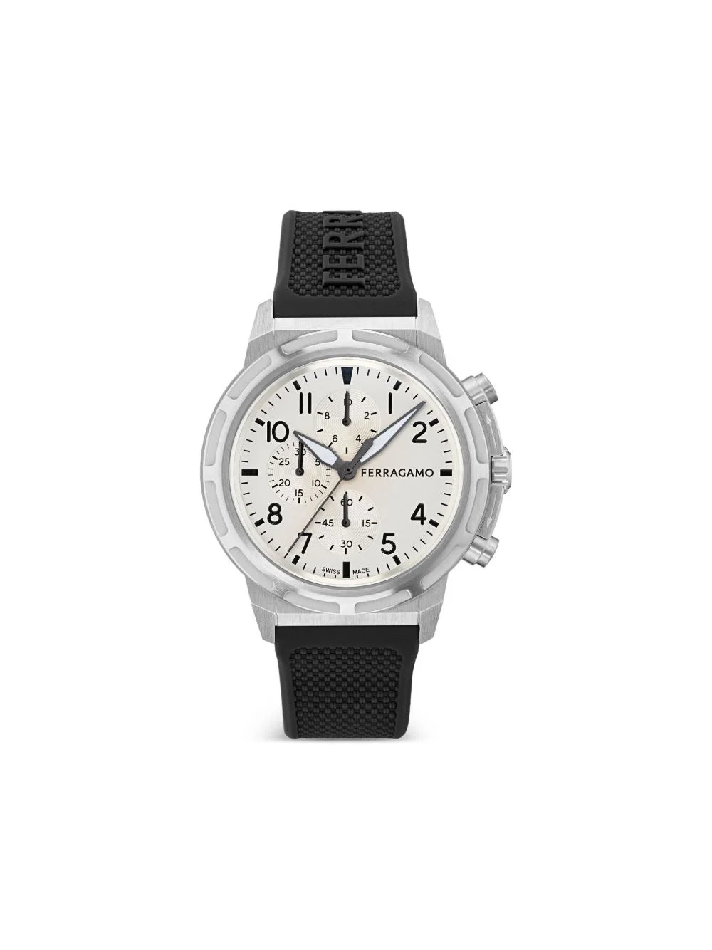 chronograph 44mm Highlights - 44mm - White - Stainless steel - Round face - Arabic dial - Baton hands - Chronograph counters - Quartz movement - Two chronograph pushers - Screw-down crown - Rubber strap - Pin-buckle fastening - This item comes with a standard one-year warranty from the boutique. Imported Composition Rubber 100%, stainless steel 100% SIZE & FIT Measurement DIAMETER 1.73 in(4.4 cm)