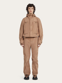 Made of technical taffeta from 100% post-consumer recycled polyester, this cool new blouson has tailoring elements and an active vibe. The cut features a drop shoulder with drawstrings on the hood and bottom hem. On the front, four double welt pockets with custom buttons are a nod to classic tailoring, echoed by the belted cuffs. Logo label is made from 100% post-consumer recycled polyester. - Composition: 100% polyester - Made In ITALY