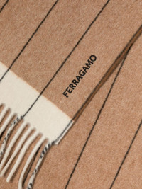 striped wool-cashmere scarf Highlights - Camel brown/black - Wool-cashmere blend - Knitted construction - Logo print to the front - Vertical stripe pattern - Fringed edge Made in Italy Composition Wool 85%, Cashmere 15% SIZE & FIT Measurement LENGTH 70.86 in(180 cm) WIDTH 11.02 in(28 cm)