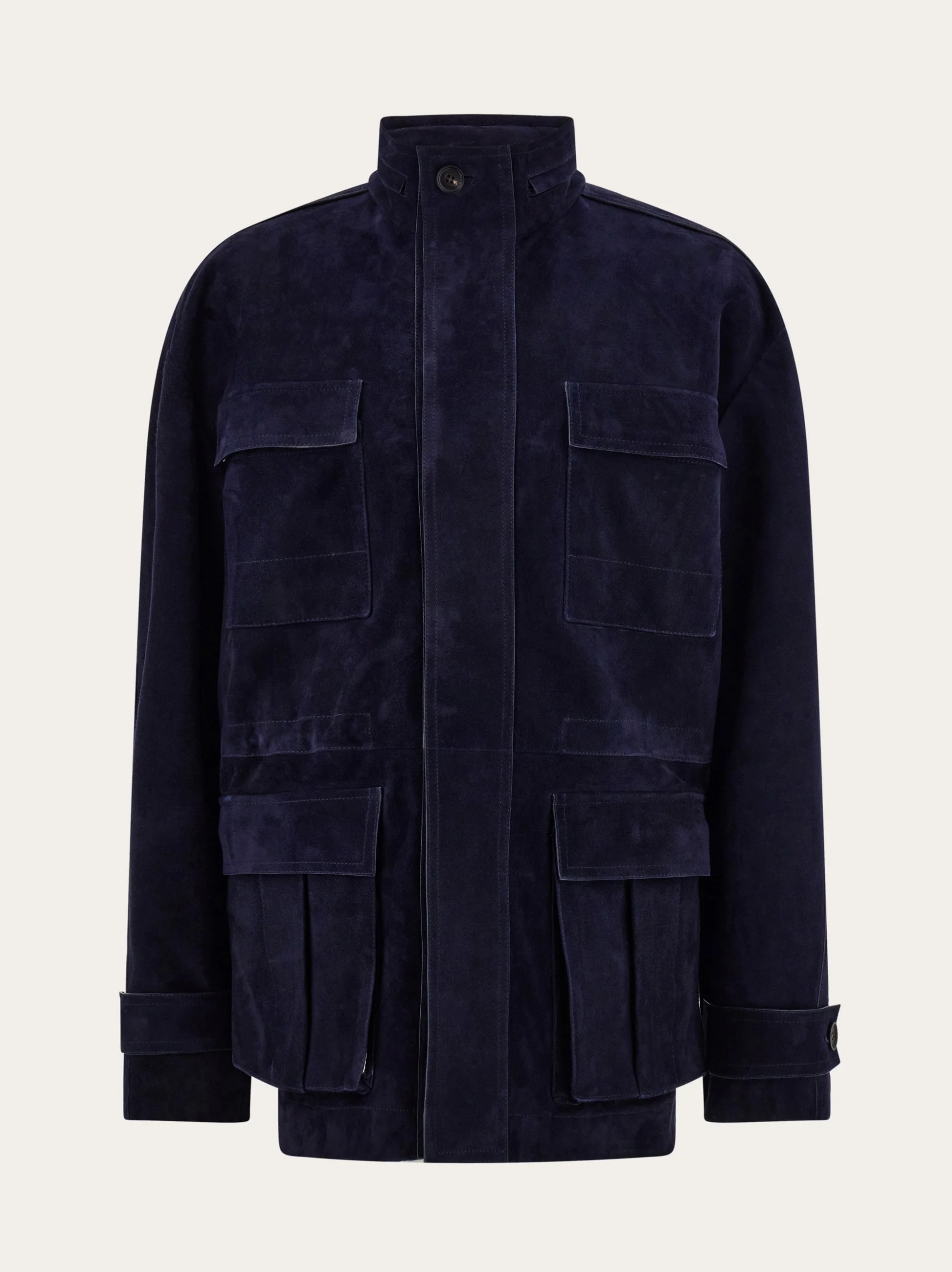 Striking suede blouson with workwear elements and parka-esque details. A truly unique piece for colder days, this nappa cover up with high collar has a hidden zip under the wide flap over the placket, maxi utility pockets on the front, and the textbook drawstring waist. Button-up straps are placed at the cuffs, and a tonal embossed logo at the back of the neck. - Composition: nappa suede - Made in ITALY - Product code: 145218 790351
