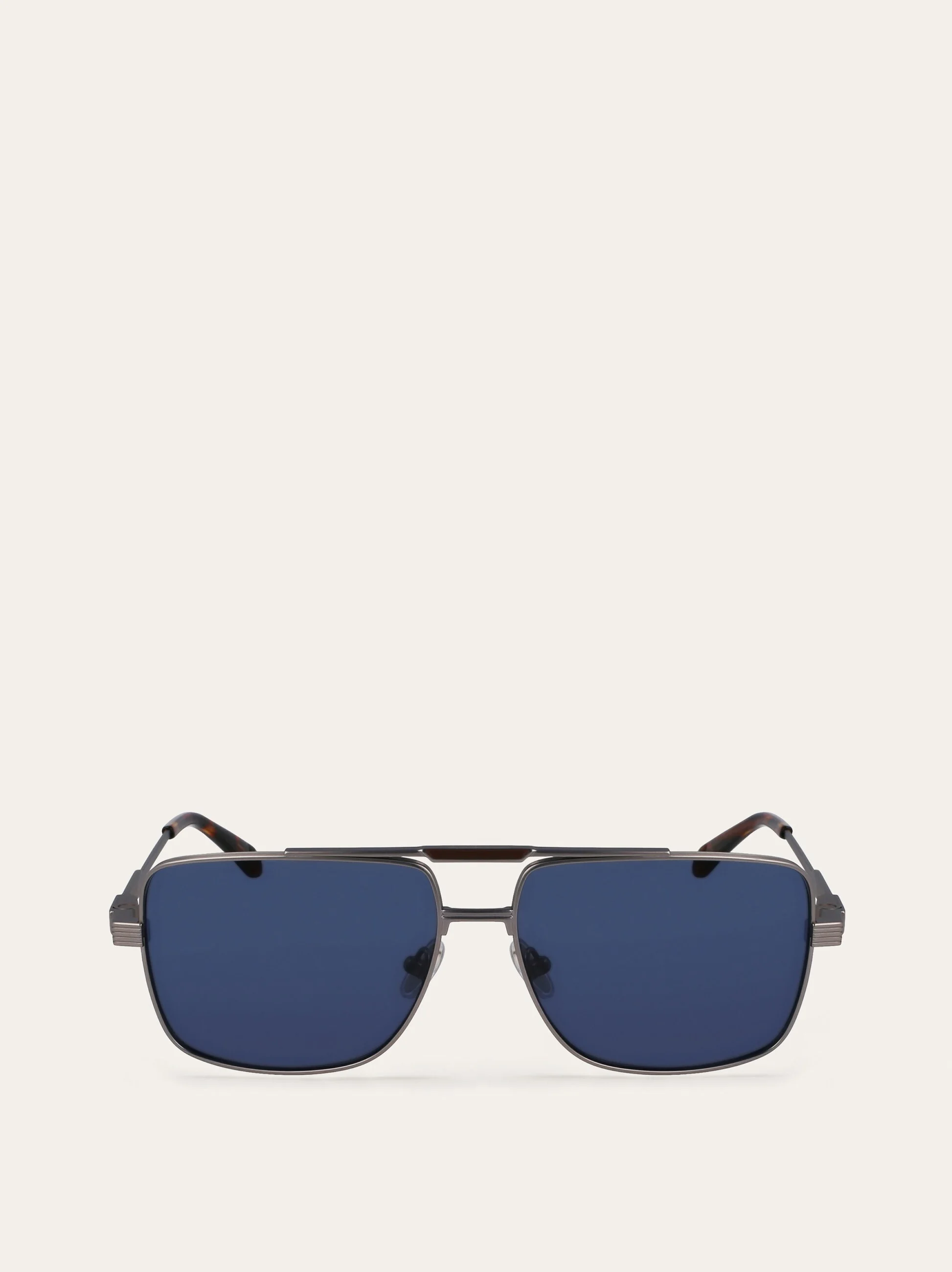 Navigator-shape men's titanium sunglasses with a double bridge. The temples and rims have been milled to produce a ribbed effect. A Gancini ornament on the temples integrates the hinge, thus having a decorative but also functional role. The Ferragamo logo is lasered on the temples and the double bridge's top bar. - Composition: titanium - Anti-UV, anti-scratch lenses - Adjustable silicone nosepads, suitable for any fit. Lens-nose-temple sizes: 60-15-145 mm - Frame compatible with graduated lenses - Made in ITALY - Product code: 51S318 782066