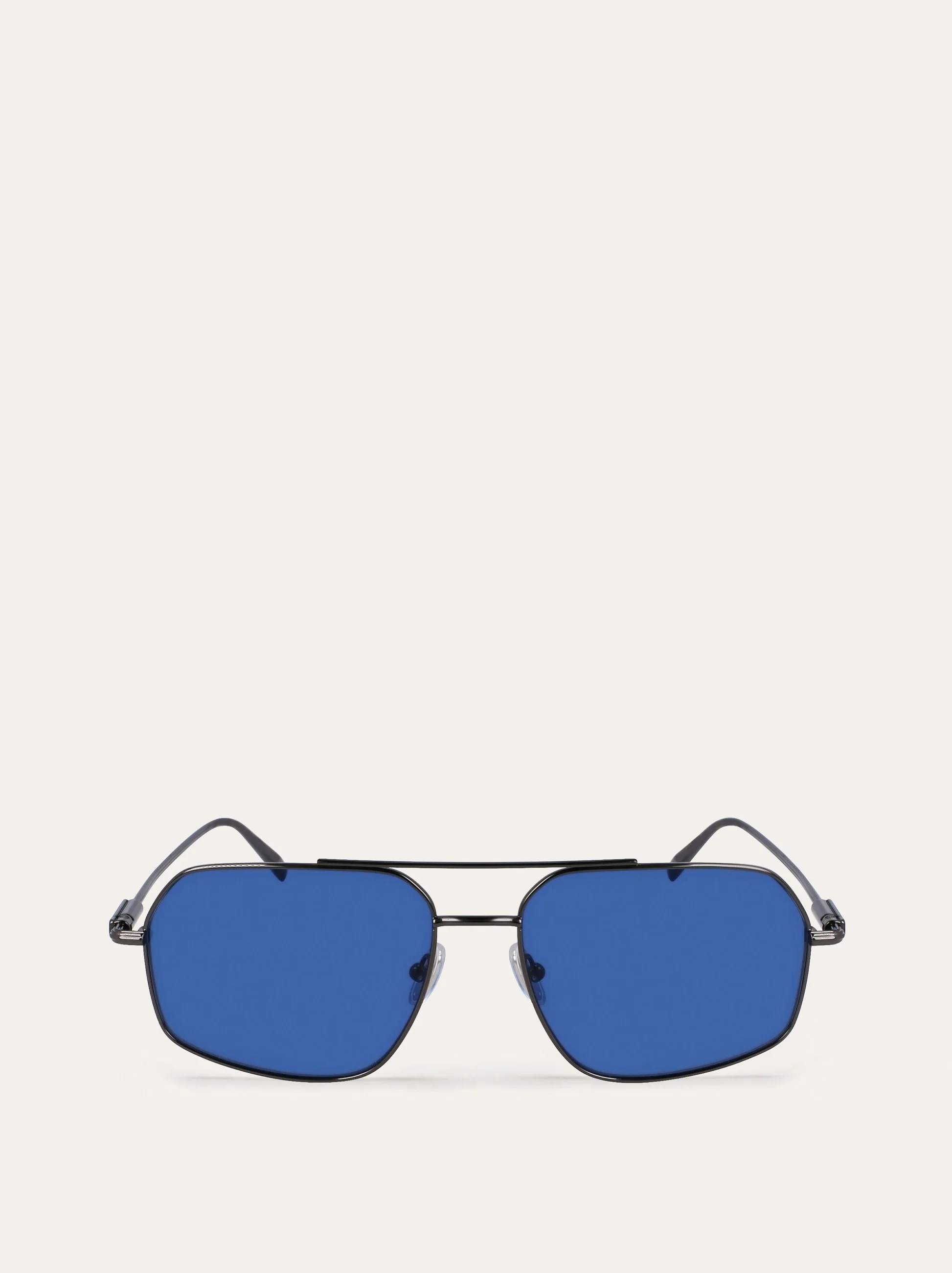 These extraordinarily lightweight navigator-shaped double-bridge sunglasses feature metal temples decorated with a prism-effect Gancini detail that integrates the hinge and extends to the lenses. - Composition: metal - Anti-UV, anti-scratch lenses - Adjustable silicone nosepads, suitable for any fit. Lens-nose-temple size: 58-17-145 mm - Frame compatible with graduated lenses - Made in ITALY - Product code: 51S313 774415