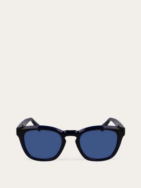 Rectangular men's acetate sunglasses with a flat top. The temples feature a prism ornament, both a decorative and functional element that acts as an end piece on the frame. - Composition: acetate - Anti-UV, anti-scratch lenses - Global fit. Lens-nose-temple sizes: 50-22-145 mm - Frame compatible with graduated lenses - Made in ITALY - Product code: 51H034 782115