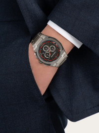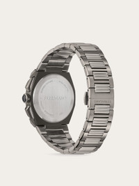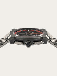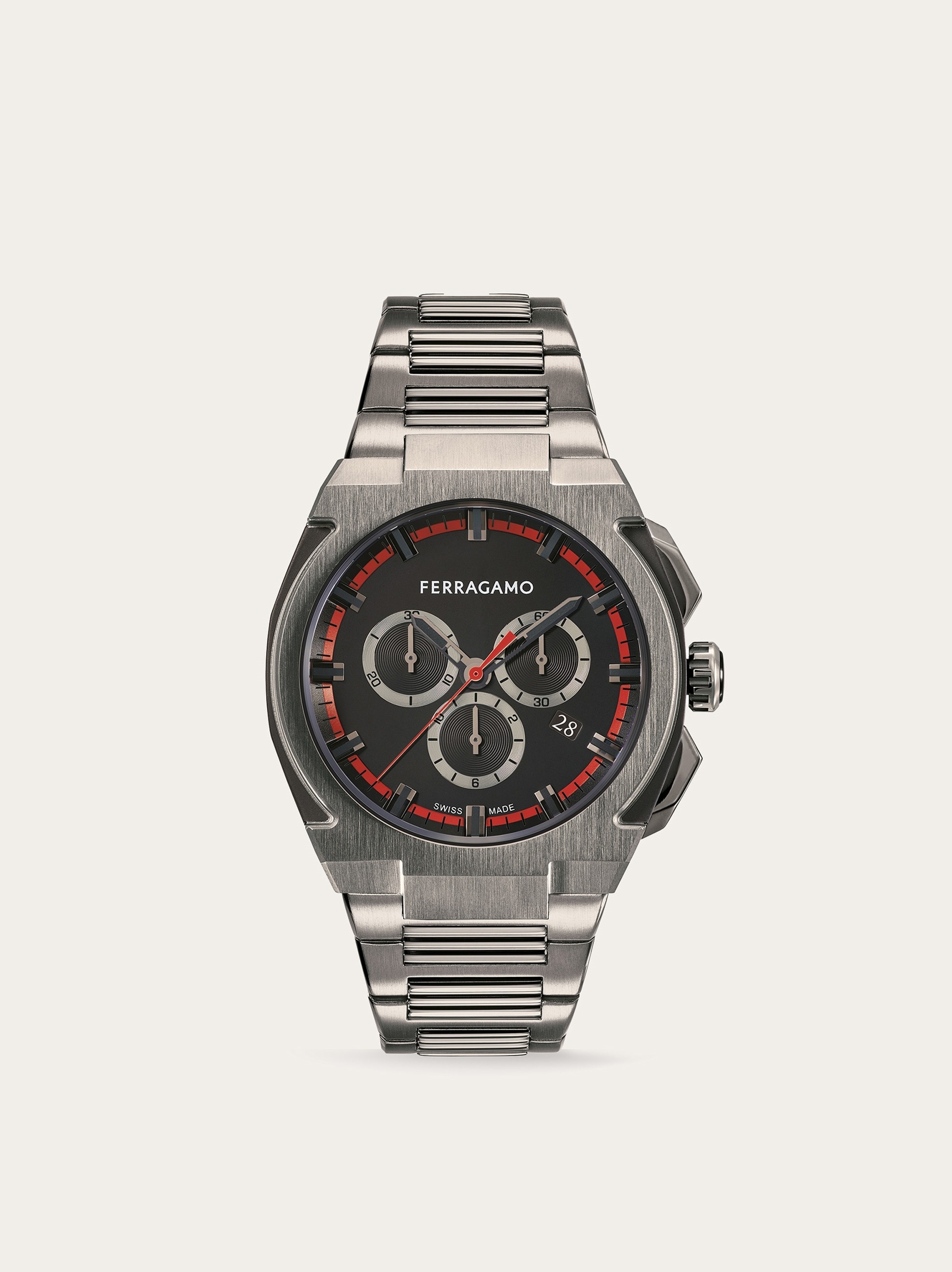 The quintessence of the House’s sports luxury spirit, the Ferragamo Supreme Chrono features a refined construction in contrasting textures and finishes. <BR> <BR>Size: 43 mm <BR>Movement: RONDA 5030D - Chrono quartz <BR>Case: Bicolor (IP Gun and IP Black) Gancini-shaped <BR>Dial: Black matte with red accents <BR>Bracelet: IP Gun bracelet - Butterfly buckle with Ferragamo logo <BR>Glass: Sapphire crystal anti-reflection, scratch-resistant <BR>WaterResistance: 50 meters <BR>2+2 Year Warranty <BR>Outer box, packaging, warranty and instruction booklet - Composition: Stainless steel case with IP black treatment and bracelet - Made in SWISS - Product code: 611293 766032