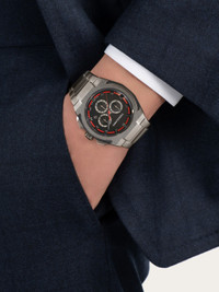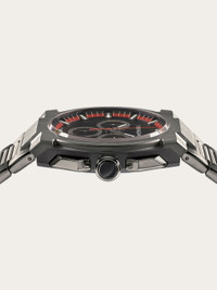 The quintessence of the House’s sports luxury spirit, the Ferragamo Supreme Chrono features a refined construction in contrasting textures and finishes. Size: 43 mm Movement: RONDA 5030D - Chrono quartz Case: Bicolor (IP Gun and IP Black) Gancini-shaped Dial: Black matte with red accents Bracelet: IP Gun bracelet - Butterfly buckle with Ferragamo logo Glass: Sapphire crystal anti-reflection, scratch-resistant WaterResistance: 50 meters 2+2 Year Warranty Outer box, packaging, warranty and instruction booklet - Composition: Stainless steel case with IP black treatment and bracelet - Product code: 611293 766032 - Made in SWISS