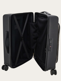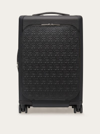 Refined semi-rigid trolley with an ultra-light, technical material shell, a hammered leather insert and a large front pocket with embossed Gancini texture. Elegant and distinctive, it ensures maximum functionality with its inner compartments, the numerical padlock closure, the four pivoting wheels and extendable handle. Double deck main compartment with the double-slider metal zip fastening. - height 21.6 IN length 14.9 IN width 8.2 IN - Composition: embossed and hammered calfskin - Made in ITALY - Product code: 241548 769614