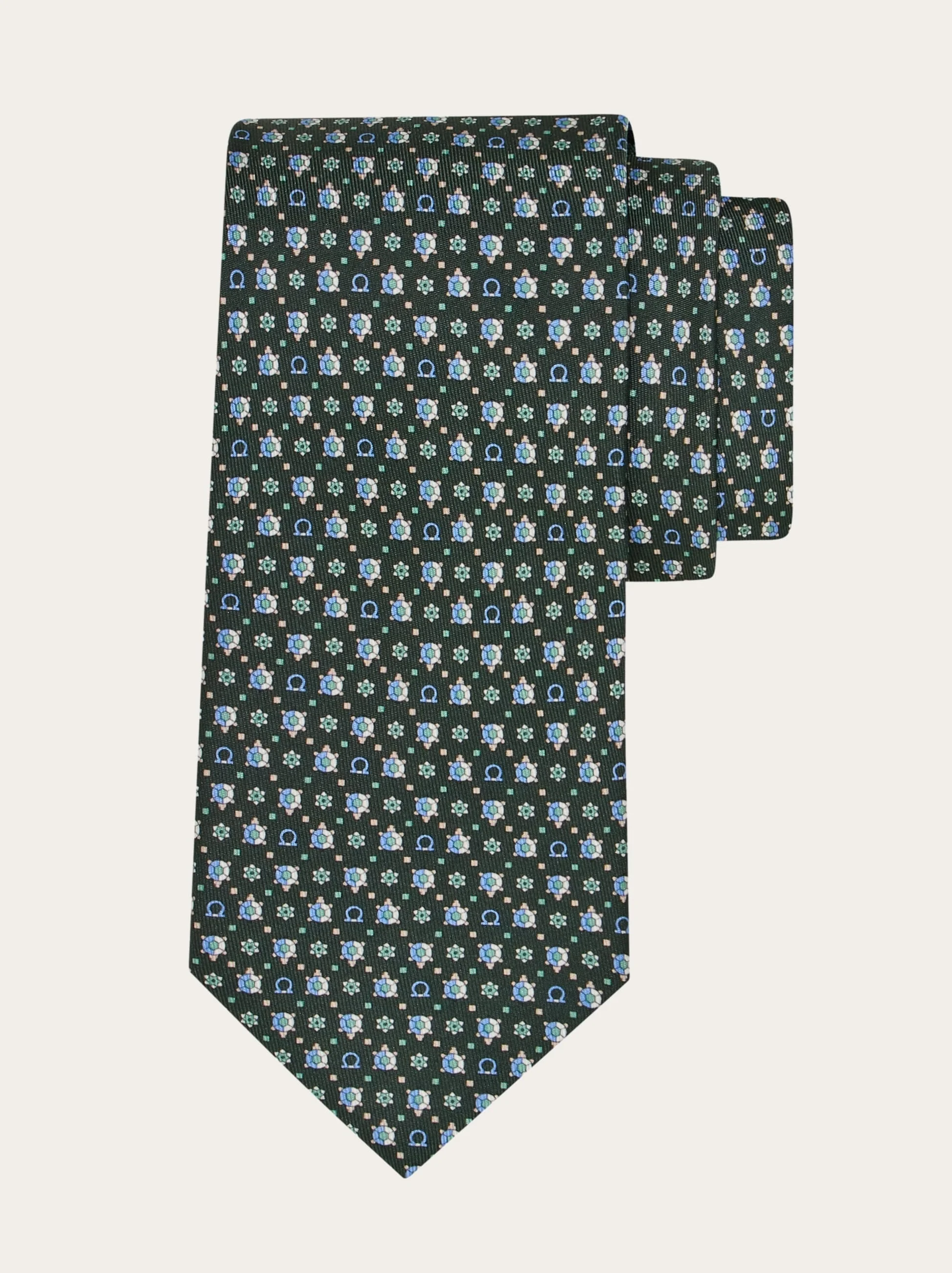 Stylized turtles that look like gemstones echo the light-hearted sophistication of this new Ferragamo tie. Printed on pure silk, the graphic pattern also features the iconic Gancini. - Composition: 100% silk - Made in ITALY - Product code: 351289 785394