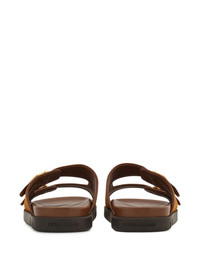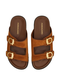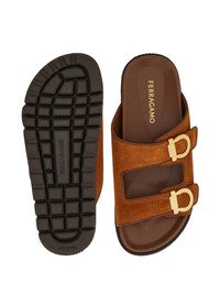 two-strap flat sandals Highlights - Cognac brown - Moulded footbed - Rubber lug sole - Gancini buckle Made in Italy Composition Lining: Fabric 50%, Lambskin 50% Outer: Calf Suede 100% Sole: Rubber 100%
