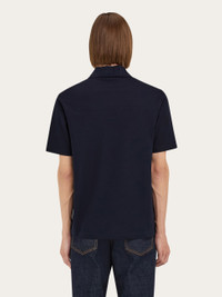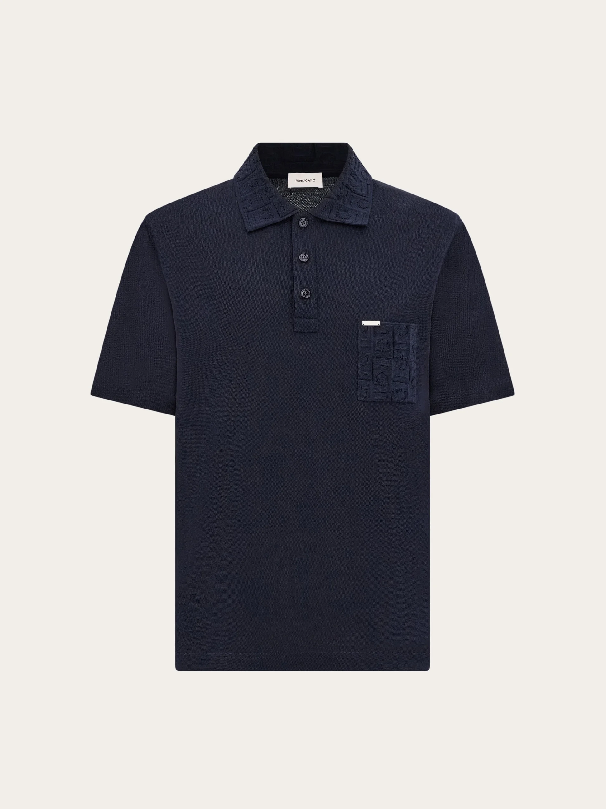 The perfect piece for smart-casual looks, Ferragamo style. This short sleeved cotton pique jersey polo shirt is elevated by a tonal jacquard monogram on the collar and applied chest pocket. The workmanship is unmistakable, and punctuated by a button up collar and custom metal tab above the pocket. - Composition: 100% cotton - Made in ITALY - Product code: 122611 781014