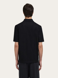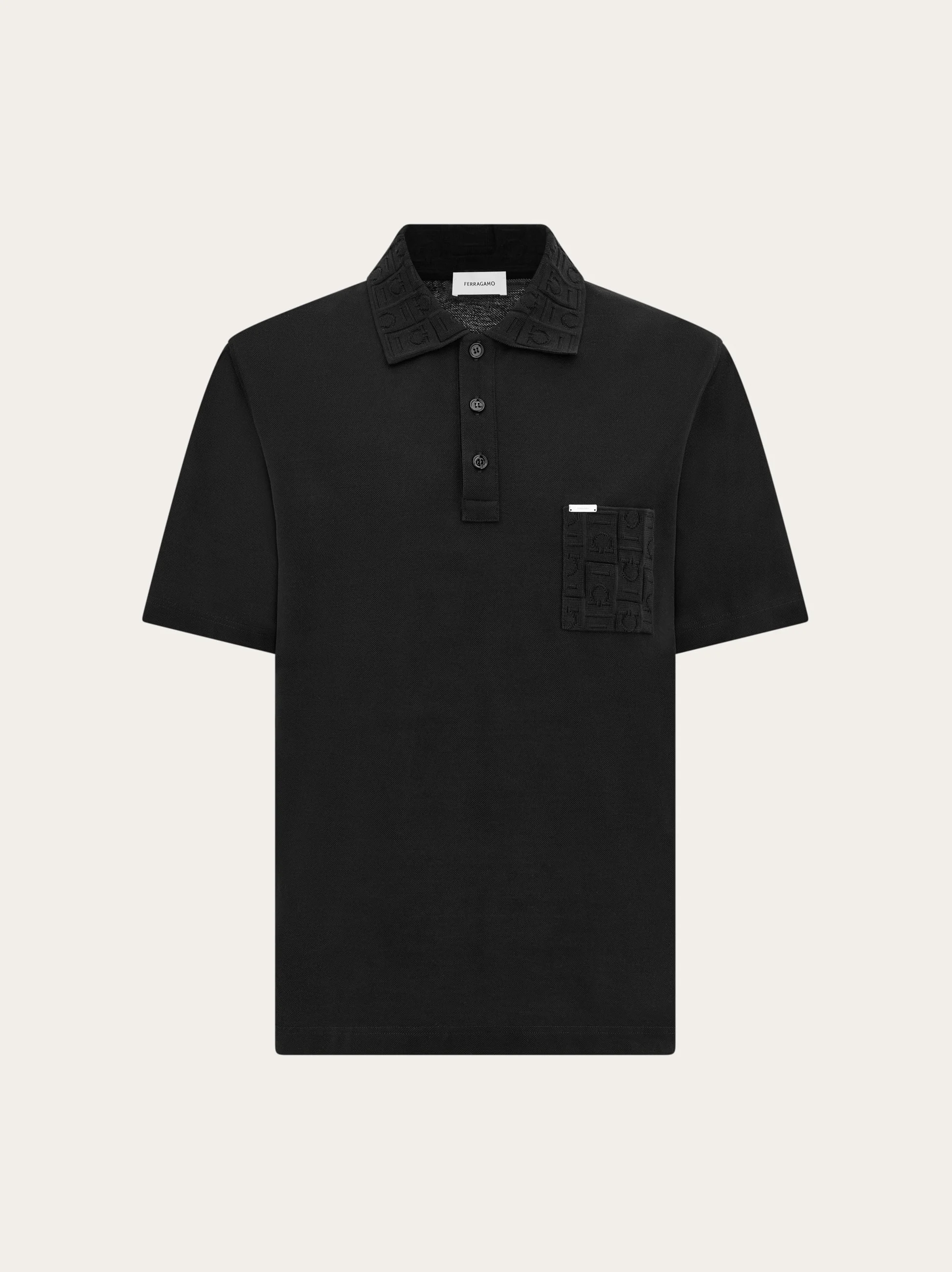 The perfect piece for smart-casual looks, Ferragamo style. This short sleeved cotton pique jersey polo shirt is elevated by a tonal jacquard monogram on the collar and applied chest pocket. The workmanship is unmistakable, and punctuated by a button up collar and custom metal tab above the pocket. - Composition: 100% cotton - Made in ITALY - Product code: 144798 788366