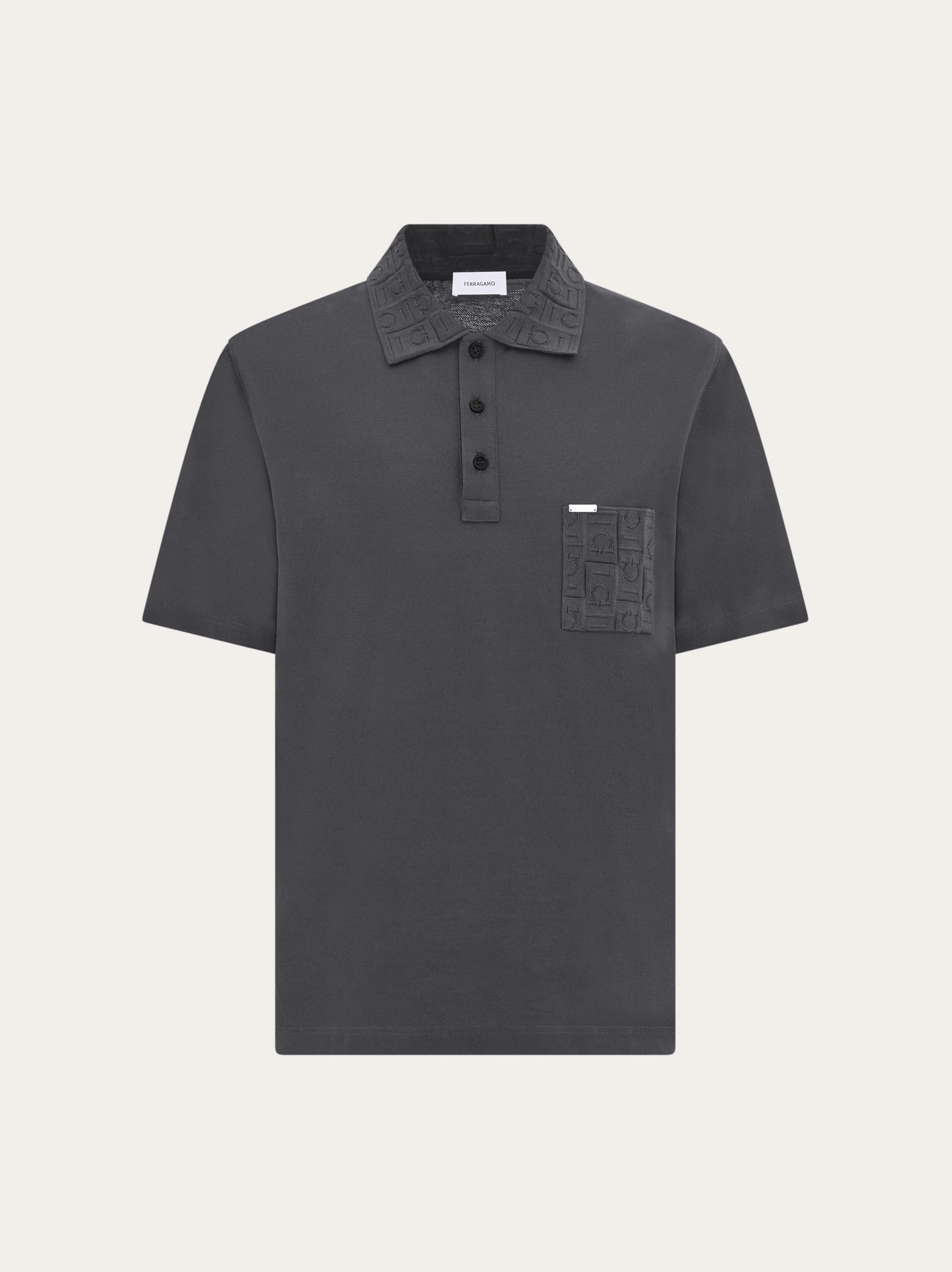 The perfect piece for smart-casual looks, Ferragamo style. This short sleeved cotton pique jersey polo shirt is elevated by a tonal jacquard monogram on the collar and applied chest pocket. The workmanship is unmistakable, and punctuated by a button up collar and custom metal tab above the pocket. - Composition: 100% cotton - Made in ITALY - Product code: 144798 791684