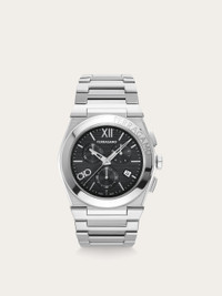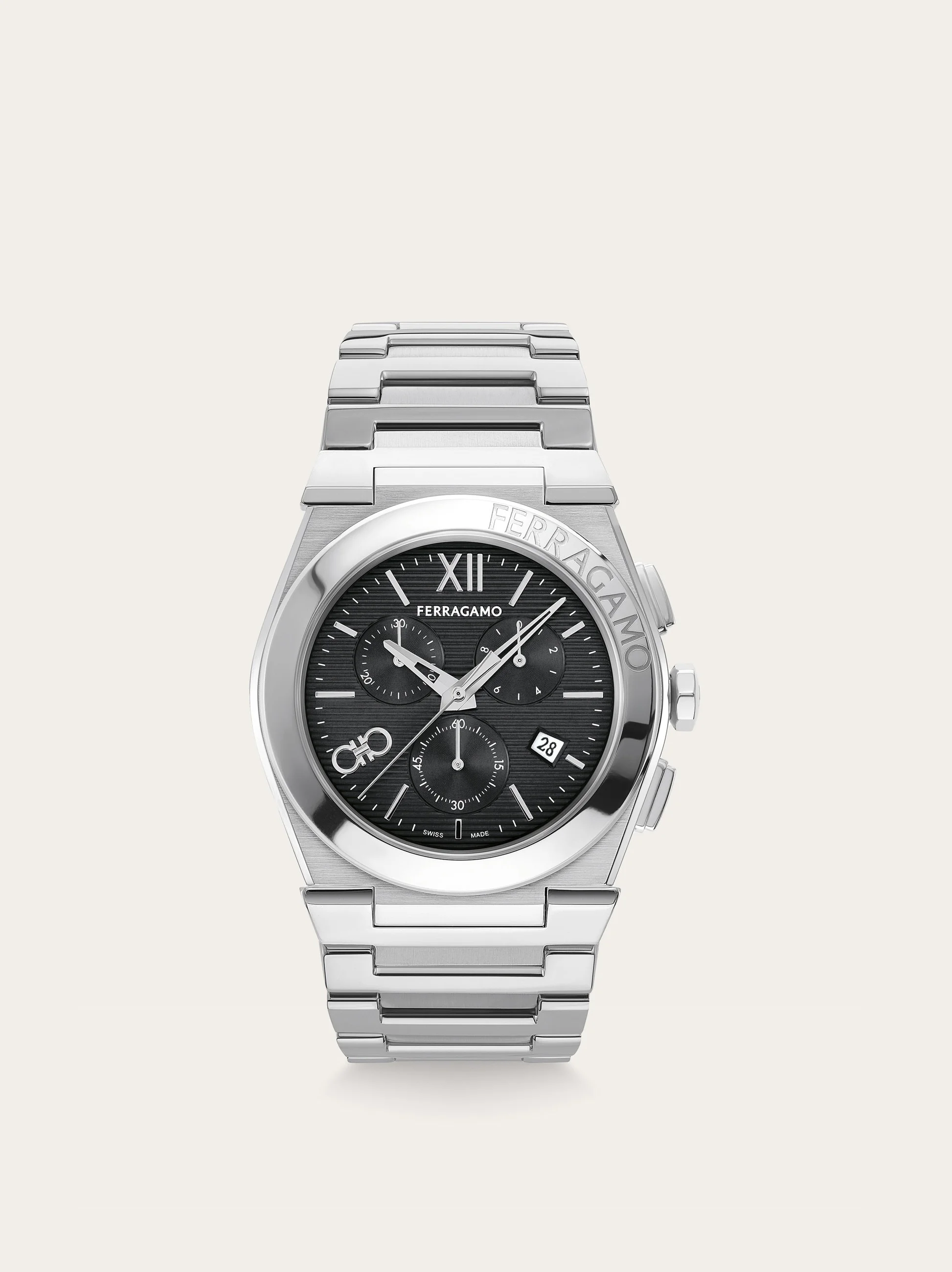 The geometrical forms typical of the Vega collection reflect the House’s contemporary minimalism. The clean lines and sharp angles of this chronograph, with Roman numerals and indexes, characterize a sporty and contemporary style. Size: 42 mm Movement: VERTIME BV SM927 - Chrono Quartz Case: Stainless steel with Ferragamo lettering Dial: Black guilloche dial with applied double Gancini logo index Bracelet: Stainless steel - Butterfly buckle with Ferragamo Logo Glass: Sapphire crystal, anti-reflection, scratch-resistant WaterResistance: 50 meters 2+2 Year Warranty Outer box, packaging, warranty and instruction booklet - Composition: Stainless steel case and bracelet - Made in SWISS - Product code: 611243 772470