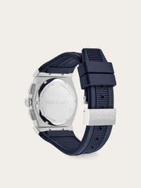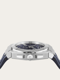 The geometrical forms typical of the Vega collection reflect the House’s contemporary minimalism. The clean lines and sharp angles of this chronograph, with Roman numerals and indexes, characterize a sporty and contemporary style. Size: 42 mm Movement: VERTIME BV SM927 - Chrono Quartz Case: Stainless steel with Ferragamo lettering Dial: Blue guilloche dial with applied double Gancini logo index Bracelet: Blue recycled PU strap - Butterfly buckle with double Ferragamo logo Glass: Sapphire crystal, anti-reflection, scratch-resistant WaterResistance: 50 meters 2+2 Year Warranty Outer box, packaging, warranty and instruction booklet - Composition: Stainless steel case and recycled PU strap - Made in SWISS - Product code: 611242 772468