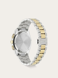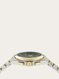 The Vega Upper East collection reinvents the distinctive geometric lines of this best-selling range with a chronograph version whose sporty structures and luxurious silhouettes adorned with signature details pay homage to the Maison’s rich heritage and exceptional craftsmanship. Size: 42 mm Movement: VERTIME BV SM927-Chrono Quartz Case: Bicolor (stainless steel & IP yellow gold) - Crown with embossed “F” Dial: Green sunray guilloche, applied indexes and double Gancini at 8h Bracelet: Bicolor (stainless steel & IP yellow gold) bracelet - Butterfly buckle with Ferragamo logo Glass: Sapphire crystal anti-reflection, scratch-resistant WaterResistance: 50 meters 2+2 Year Warranty Outer box, packaging, warranty and instruction booklet - Composition: Stainless steel and IP yellow gold case and bracelet - Made in SWISS - Product code: 611316 781681