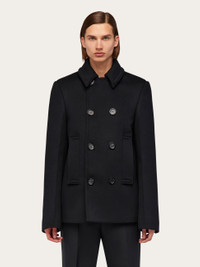 A wardrobe classic with a decidedly current feel, this Ferragamo Peacoat is made from a blend of pure wool and cashmere. Soft and warm, it has double buttons that fasten up under the collar, which features a nautical inspired strap complemented by the pronounced stitching along the back and sleeve. The regular fit includes a strong shoulder for a decisive look. - Composition: 85% pure virgin wool, 15% cashmere - Made in ITALY - Product code: 144166 777763