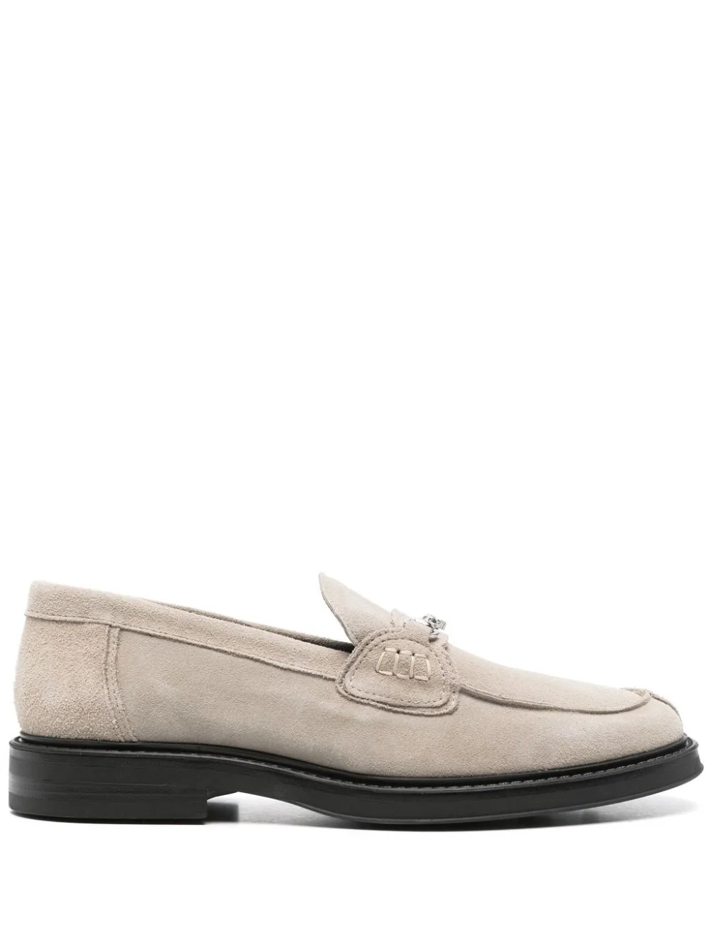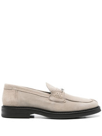 suede loafers Highlights - Taupe grey - Calf suede - Slip-on style - Horsebit detail - Handshake motif - Moc stitching - Almond toe - Branded leather insole - Leather lining - Low stacked heel - Rubber outsole Imported Composition Sole: Rubber 100% Outer: Calf Suede 100% Lining: Calf Leather 100%