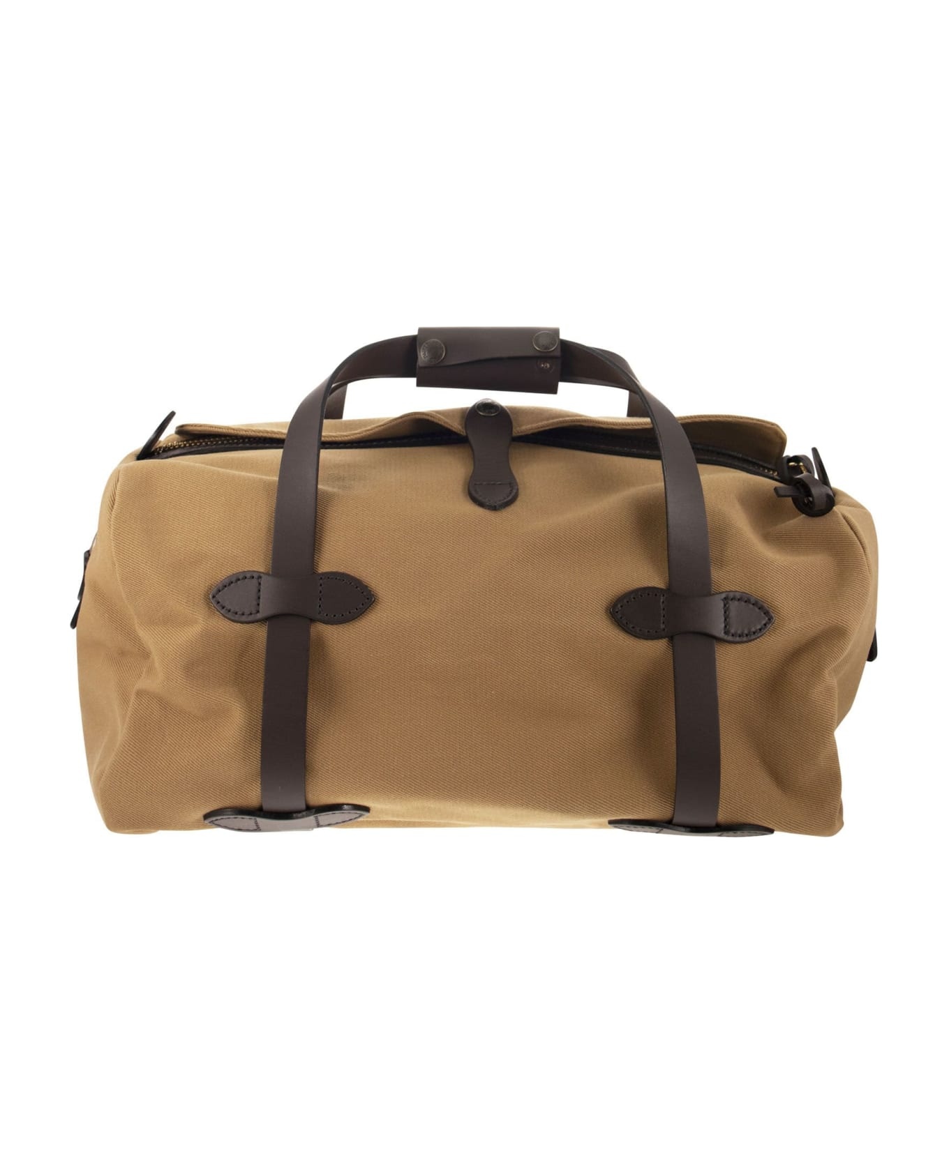 The small duffle bag is made of water-repellent, abrasion-resistant Rugged Twill and finished in premium Italian calf leather to create a compact and reliable travel bag that meets airline carry-on size restrictions. The rustproof brass zip and rain flap closure offer additional protection from the elements, making this versatile bag ideal for overnight trips of any kind. The adjustable leather handle allows the bag to be carried on the shoulder or over the shoulder and can be removed if you prefer to carry it by hand. - Rugged Twill is water-repellent and abrasion-resistant - Adjustable and removable leather shoulder strap with shoulder pad - Premium Italian calf leather handles with two snap fasteners - Includes iconic Filson tabs in premium Italian calf leather DESIGNER ID: FMLUG0001 W0174WP 260 Composition: 100% Cotton Shell 2: 100% Leather Lining: 100% Cotton Made in: Romania Color: Brown Size and fit: - W 43 x H 25 x D 27 cm Model number: FMLUG0001W0174WP