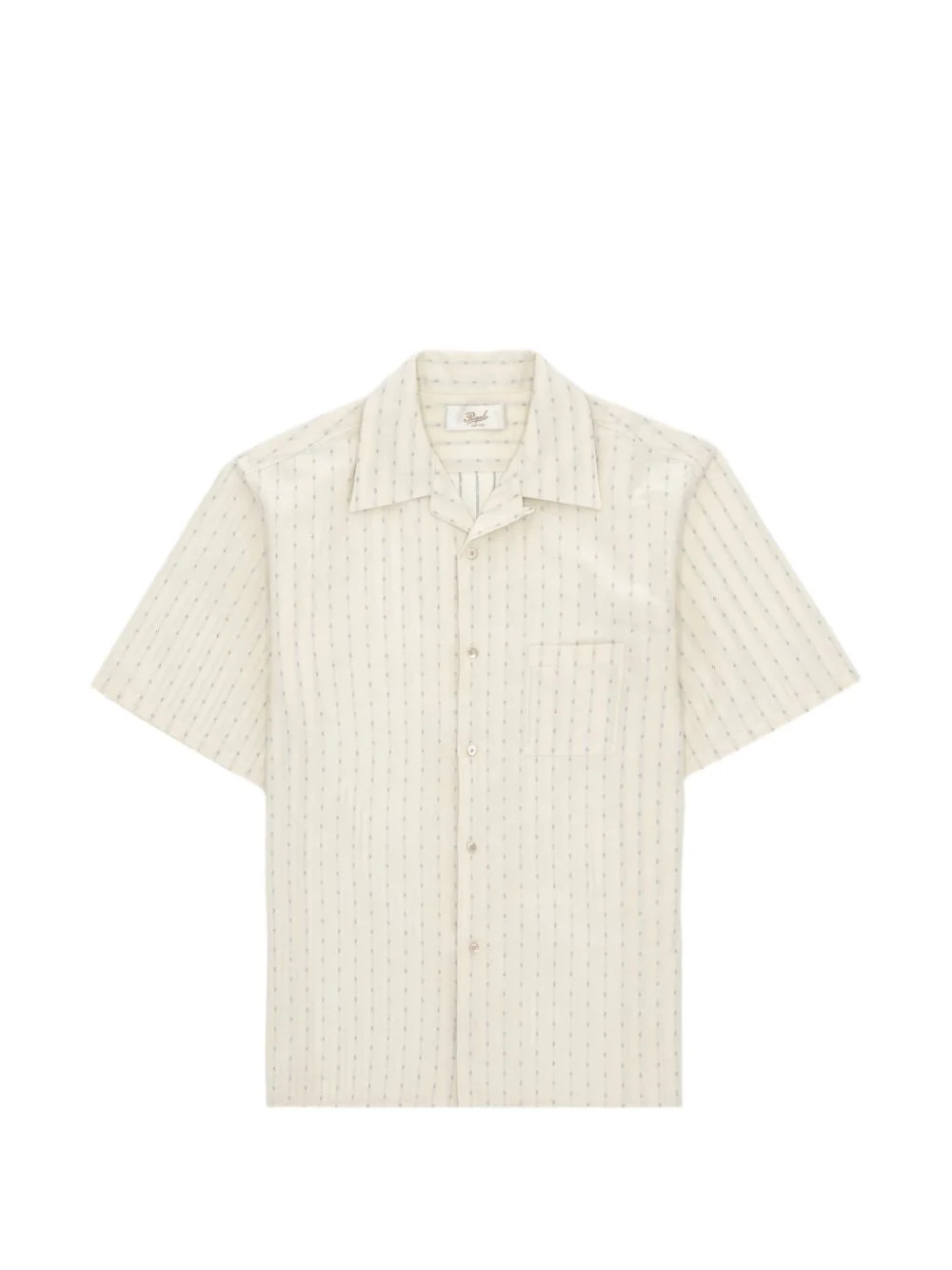 open collar striped shirt Highlights - Blue - Striped pattern - Short sleeves - Button fastening - Open collar - Back yoke Imported Composition Cotton 100% Washing instructions Read Manufacturer Guidelines