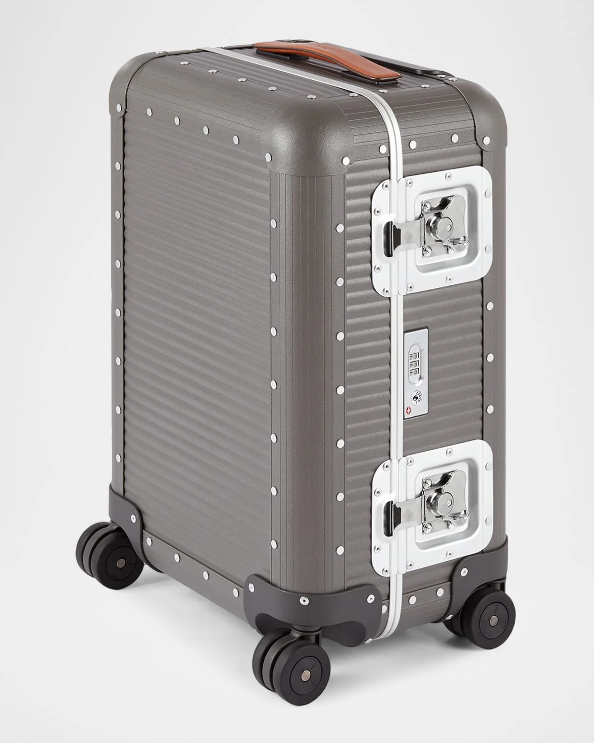 Ideal for two to three day journeys Hardsided luggage crafted of aluminum, leather, and polyester Approx. 16"W x 10"D x 22"T Top handle Butterfly closures Side handle Integrated TSA lock Four dual wheels Interior removable padded lining Interior mesh pocket Interior shirt holder Interior straps Item Weight: 12.0 lbs Lining: Polyester Trim: Leather Made in Italy