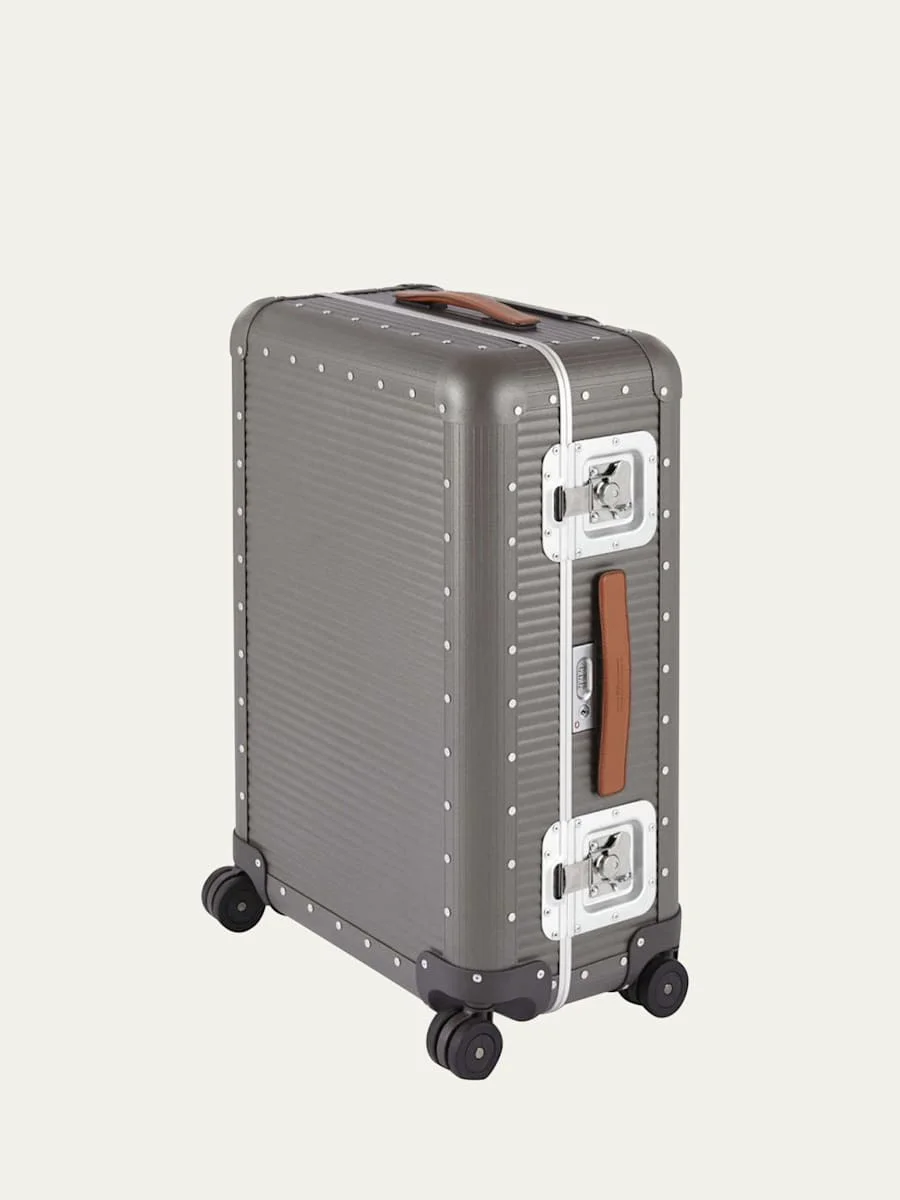 Ideal for five to six day journeys Hard-sided carry-on crafted of aluminum, leather, and polyester Approx. 18"W x 11"D x 26"T Top handle Butterfly closures Side handle Integrated TSA lock Four dual wheels Interior removable padded lining Interior straps Item Weight: 15.0 lbs Lining: Polyester Trim: Leather Made in Italy Online Inquiries: BGS21_HG32A| Store Inquiries: #4633212