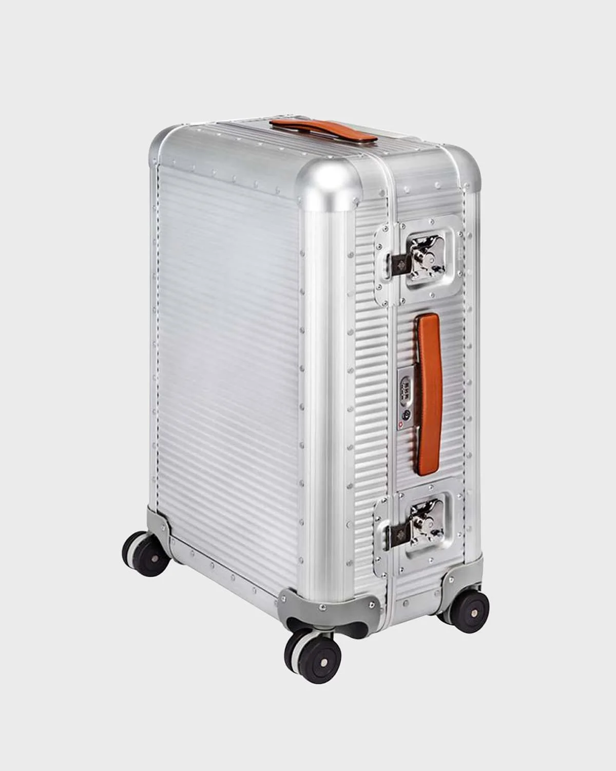 Ideal for five to six day journeys Hardsided carryon crafted of aluminum, leather, and polyester Approx. 18"W x 11"D x 26"T Top handle Butterfly closures Side handle Integrated TSA lock Four dual wheels Interior removable padded lining Interior straps Item Weight: 15.0 lbs Lining: Polyester Trim: Leather Made in Italy