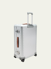 Ideal for ten to eleven day journeys Hardsided luggage crafted of aluminum, leather, and polyester Approx. 19"W x 11"D x 20"T Top handle Butterfly closures Side handle Integrated TSA lock Four dual wheels Interior removable padded lining Interior straps Item Weight: 15.0 lbs Lining: Polyester Trim: Leather Made in Italy