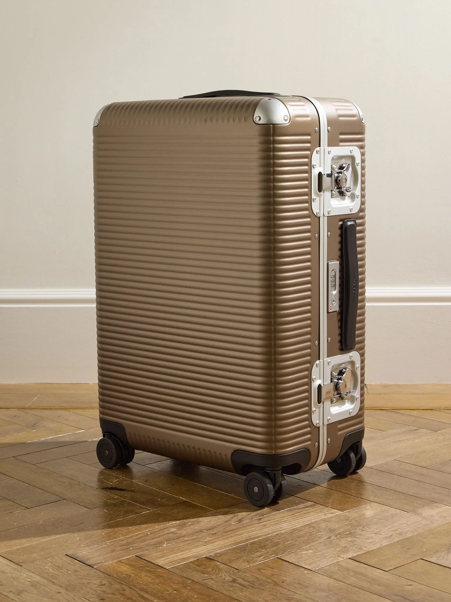 FPM Milano combines vintage style with modern design in its 'Bank Light' collection. Inspired by old-school trunks, this spinner suitcase has been crafted in Italy from Makrolon® polycarbonate that's flexible, lightweight and durable. It's reinforced with anodised aluminium corners and secures with the label's iconic butterfly clasps, plus a TSA combination lock. Details & Care - Brown Makrolon® polycarbonate - Top and side handles, telescopic handle - Four wheels, black leather trims (Calf) - Two internal dividers, webbing tie-down straps, zipped pocket - Fully lined - Butterfly lock fastenings, TSA combination lock - Designer colour: Matte Almond - Weighs approximately 5.4kg/ 11.9lbs