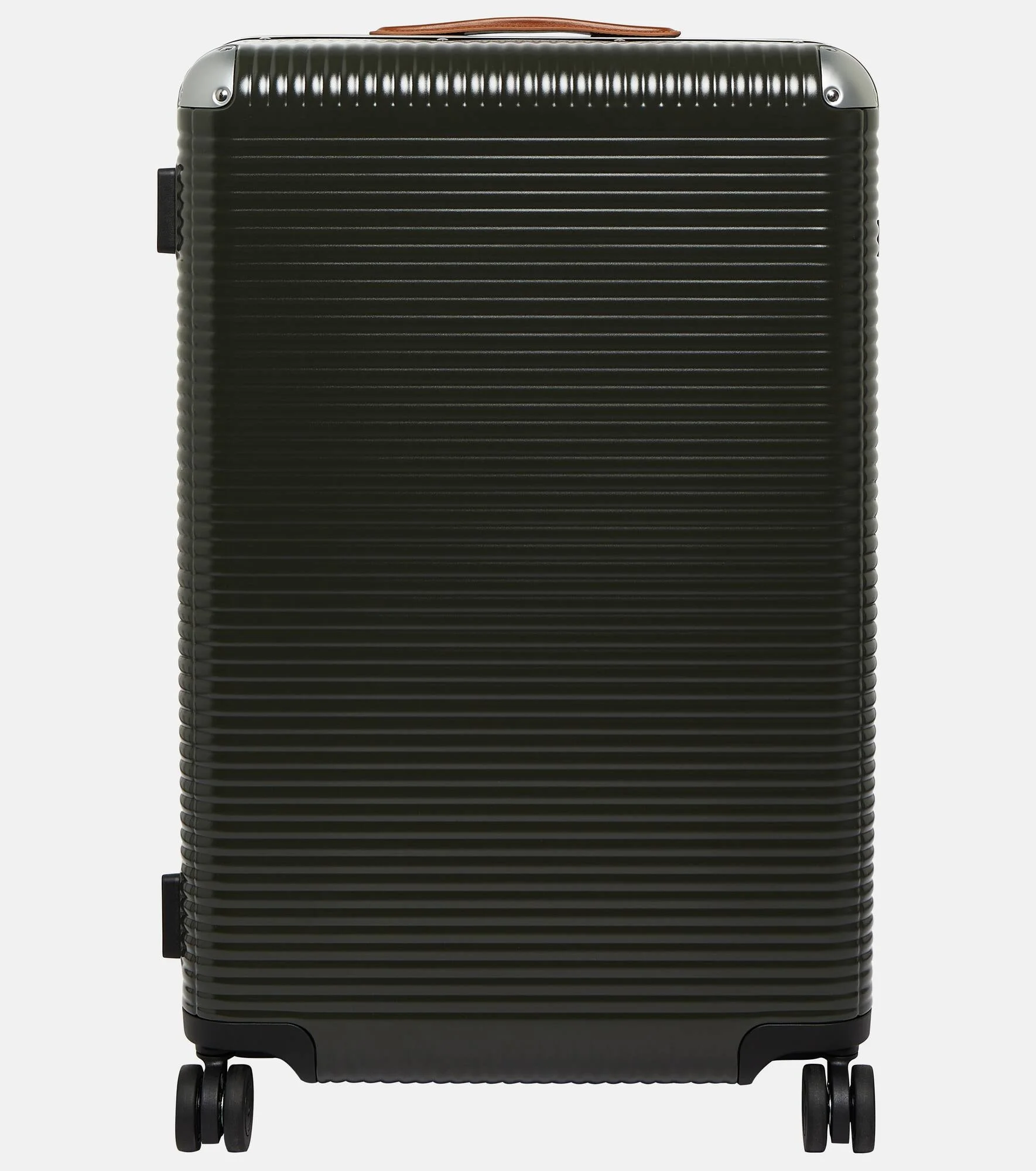 Product Details - Material: polycarbonate, aluminum, leather - Lining: fabric - Made in China - Designer color name: Moss Green - Trim: leather - Internal details: internal zipped pocket - Closure: lock-bar fastening - Adjustable top handle - Item number: P00941638 Size & Fit - Height 75cm-29.5" - Width 49cm-19.5" - Depth 28,5cm-11"
