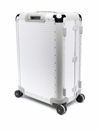 Bank S Spinner 68 aluminium suitcase moonlight silver calf leather/aluminium ribbed hard-shell outer pull top handle TSA approved lock removable lining single flat top handle clasp fastening internal buckled straps four wheels Made in Italy Composition Outer: Aluminium 100% Lining: Calf Leather 100%, Polyester 100% SIZE & FIT Measurement DEPTH 10.62 in(27 cm) HANDLE 1.96 in(5 cm) HEIGHT 25.98 in(66 cm) STRAP 15.74 in(40 cm) WIDTH 17.71 in(45 cm)